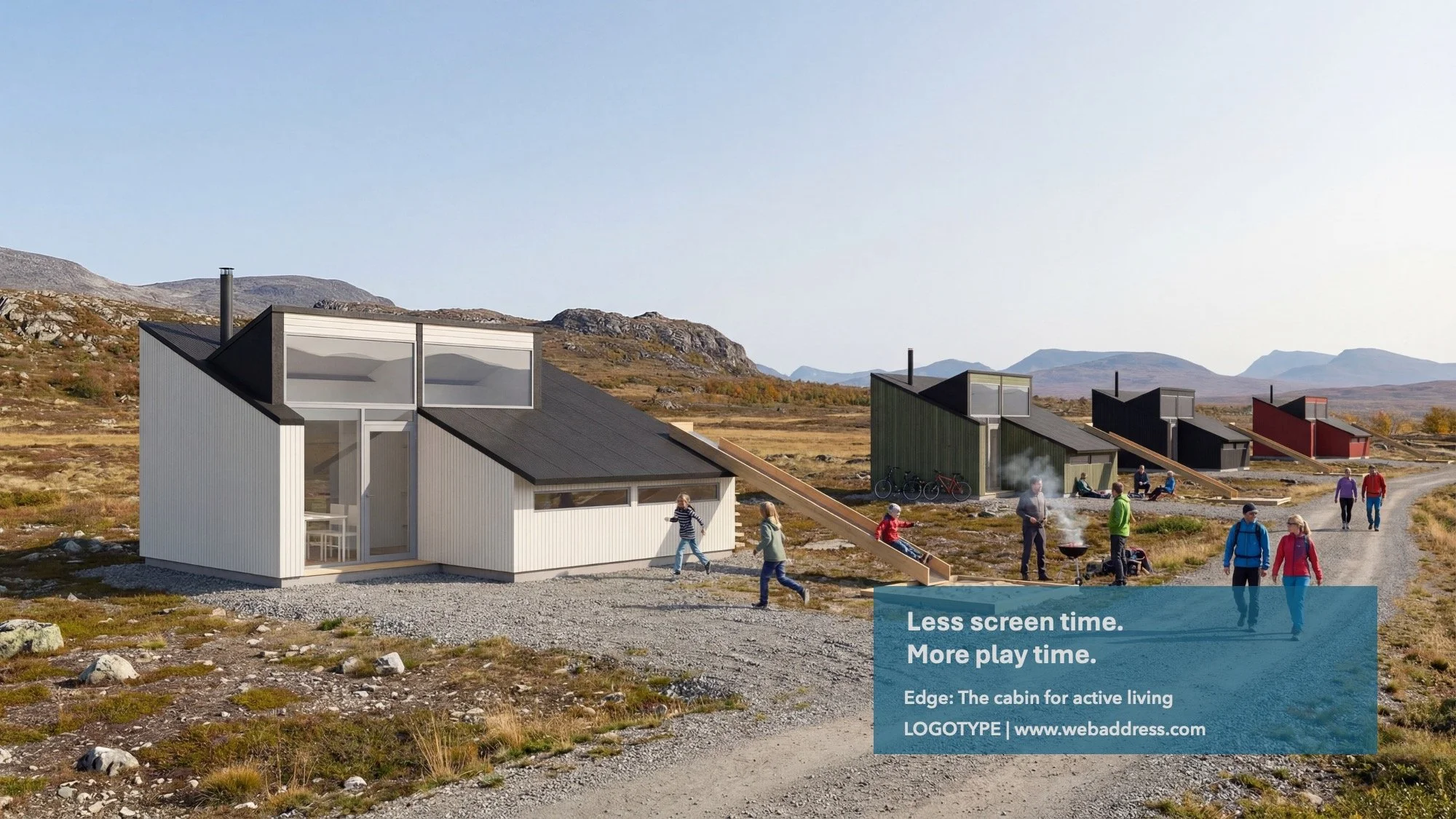 A cabin concept for active destinations, from campgrounds and ski resorts to adventure parks. A slide runs along the roof encouraging play and movement.